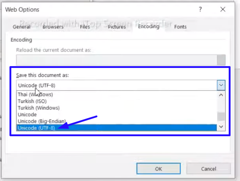 - At the bottom, select Encoding → UTF-8