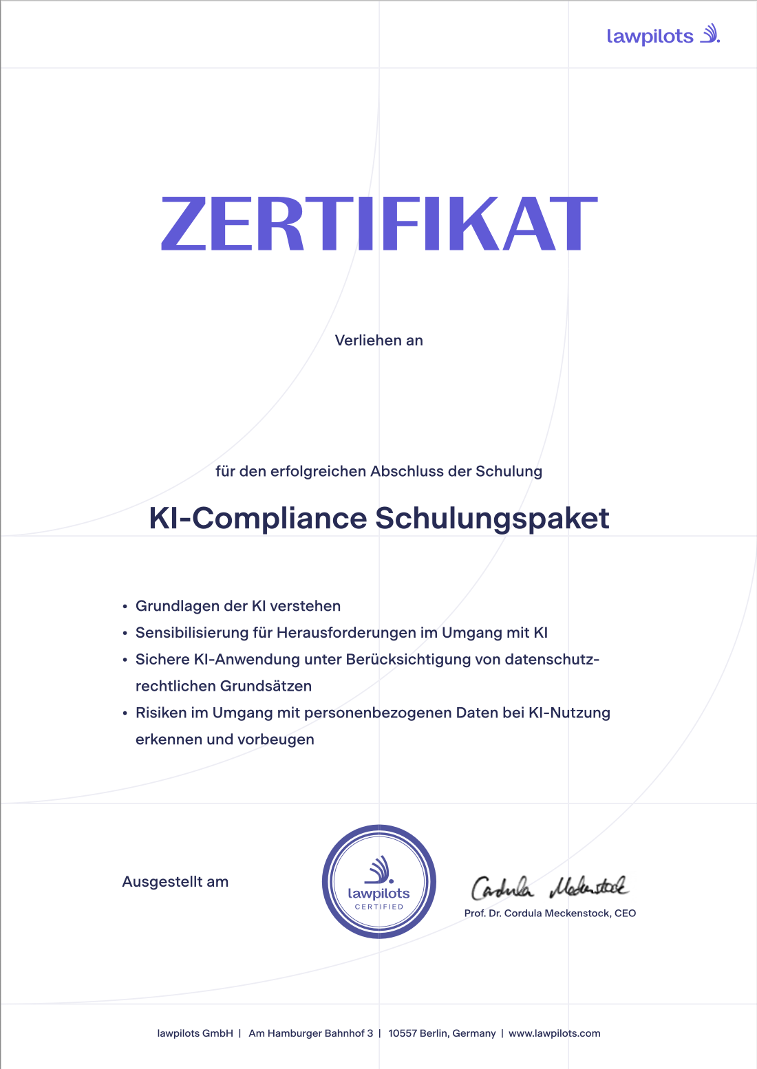 - Use the provided example certificate as inspiration — replace lawpilots branding with your own.